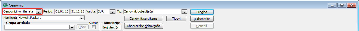 Filter sa opcijom "Cenovnici komitenata" - sastoji se od sekcije sa dugmadima i sekcije sa poljima filtera za definisanje kriterijuma pretraživanja - polje "Org.jed.:" po organizacionim jedinicama, polje "Period:" za određeni period, polje "Valuta:" po određenoj valuti i polje "Tip:" za izbor tipa cenovnika koji će biti izlistan po datumima promene cena u izabranom tipu cenovnika ( vidi sliku )