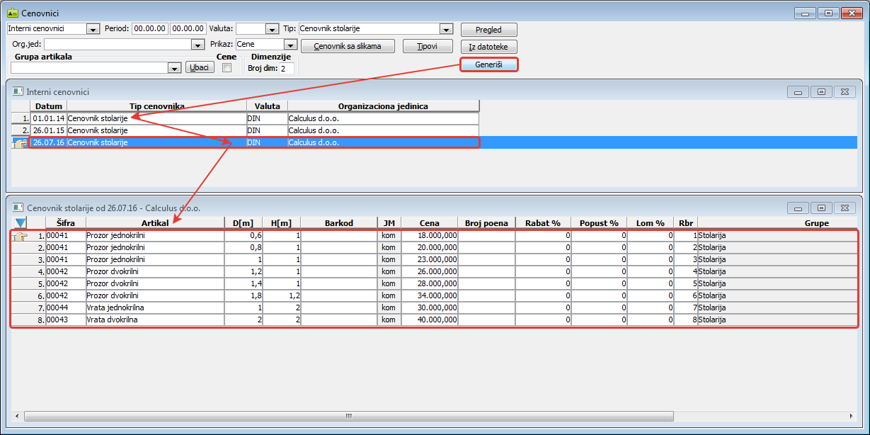 Dugme "Generiši" klonira selektovani cenovnik u podprozoru "Interni cenovnici" i automatski postavlja datumom važenja cenovnika na tekući datum ali ga možete menjati kao i stavke kloniranog cenovnika ( vidi sliku )
