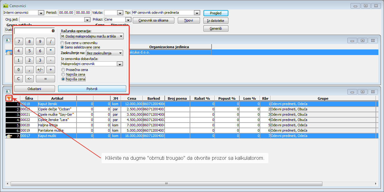 kojim se otvara prozor kalkulatora cena artikala. Kalkulator koristite kako biste odjednom ažurirali cene svih ili samo selektovanih artikala. Pored osnovnih računskih operacija, nad cenama artikala mogu se primeniti složene operacije korišćenjem cena iz cenovnika dobavljača na koje možete dodavati veleprodajnu ili maloprodajnu maržu.