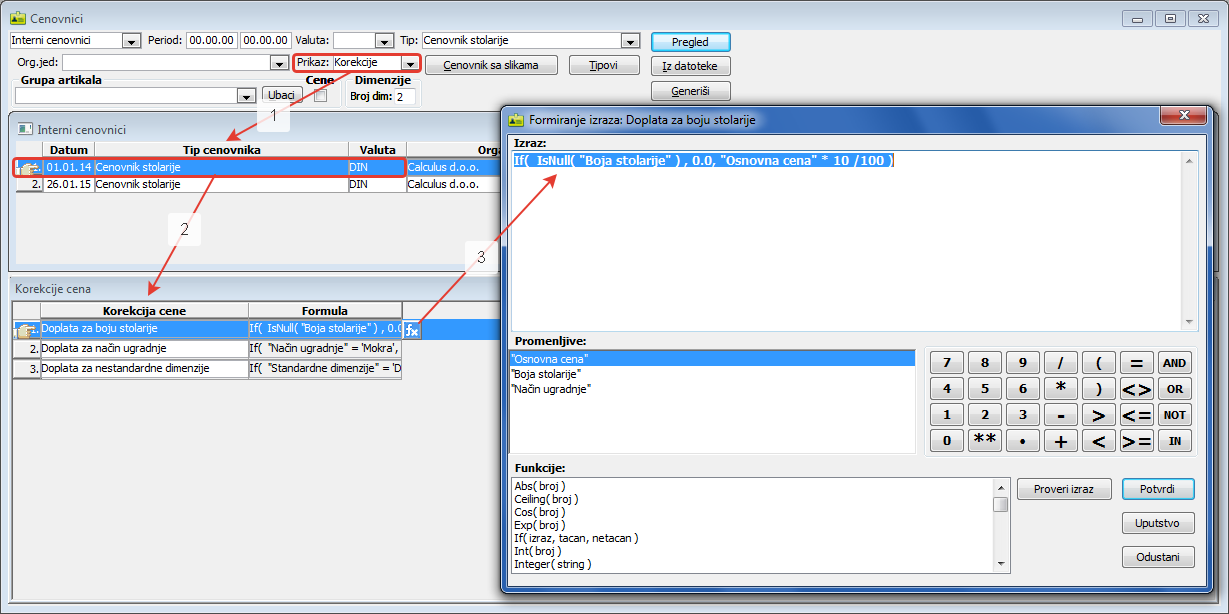 i definisanjem formule na osnovu koje će se izvršiti korekcija cene ( vidi sliku )