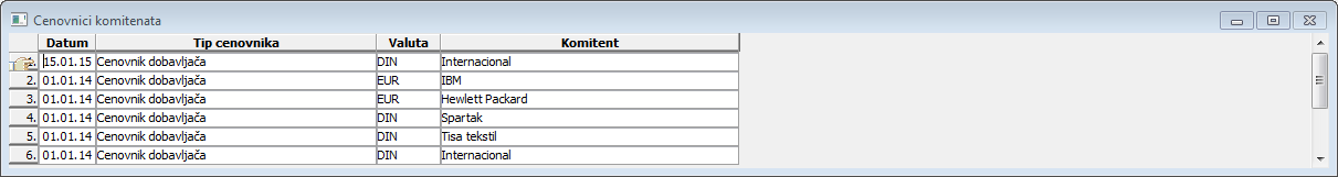 Spisak: Cenovnici komitenata - dobiće se spisak cenovnika komitenata sa: datumom njihovog nastanka, tipom kome pripada, valutom i komitentom čiji je cenovnik.