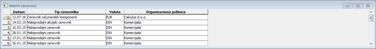 Spisak: Interni cenovnici - dobiće se spisak internih cenovnika preduzeća sa: datumom njihovog nastanka, tipom kome pripada, valutom i komitentom koji je u ovom slučaju Vaše preduzeće.