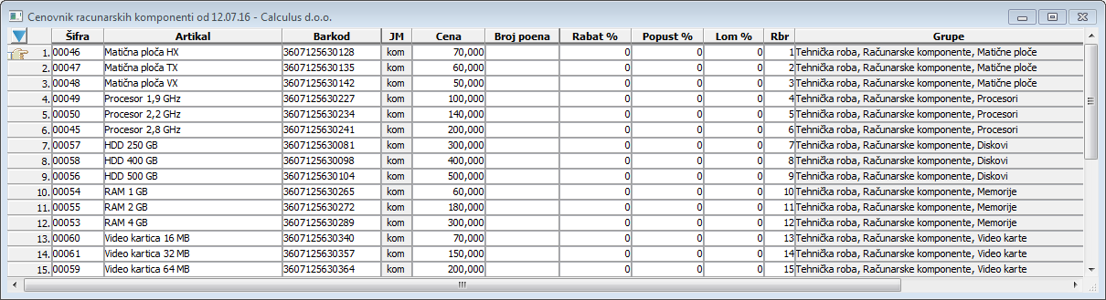 Cenovnik sa komponentama po grupama - na štampi će se videti prikaz cenovnika artikala sa komponentama po grupama kojima dati artikli pripadaju.
