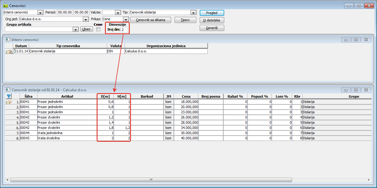 Sekcija "Dimenzije" sadrži samo polje za unos broja dimenzija "Broj dim:". Ima smisla uneti najviše pet dimenzija. Kod npr. građevinske stolarije (prozora i vrata) definišu se širina "D" i visina "H" kao dve dimenzije. Unosom cifre "2" u prozoru za prikaz artikala i cena pojaviće se još dve kolone - "D[m]" i visina "H[m]" ( vidi sliku )