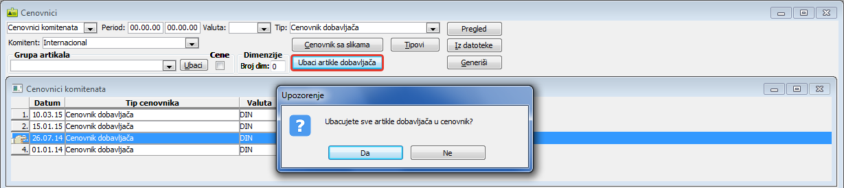 . Klikom na dugme "Ubaci artikle dobavljača" dodaju se artikli dobavljača selektovanom cenovniku komitenta ( vidi sliku )