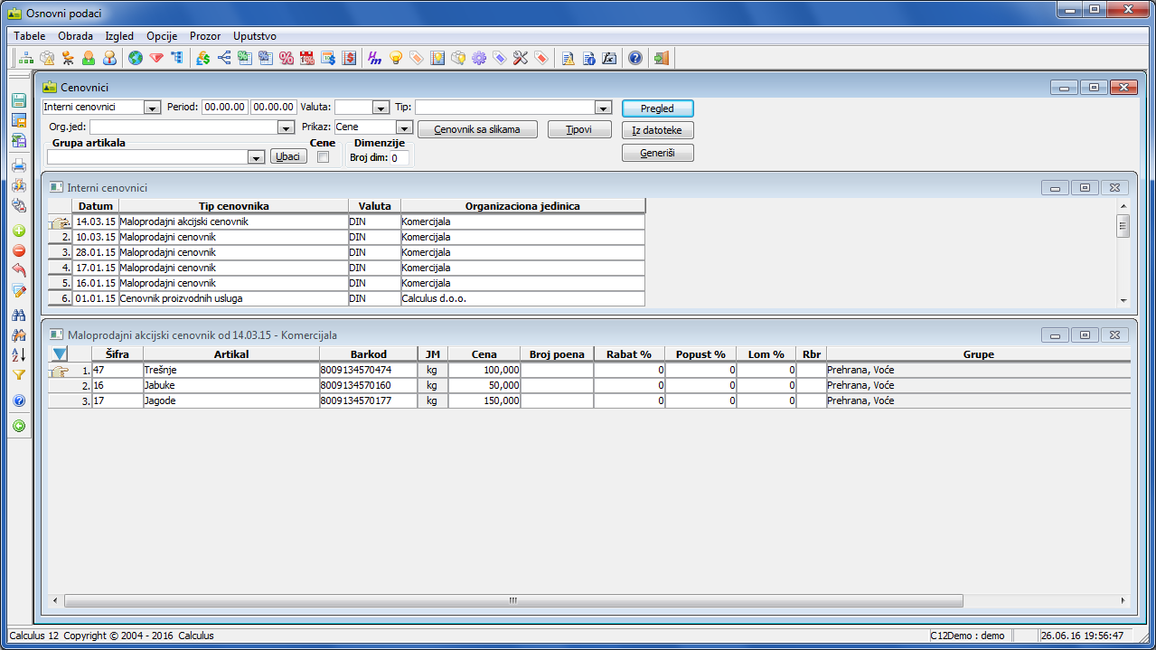 . Takođe, i u ostalim aplikacijama paketa ovaj prozor se poziva iz stavke glavnog menija "Osnovni podaci". Ovaj prozor služi za definisanje različitih cenovnika, njihov pregled i ažuriranje ( vidi sliku )