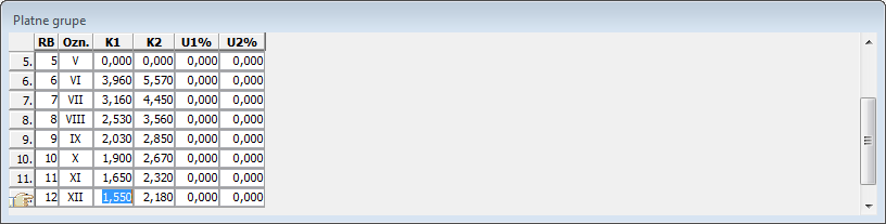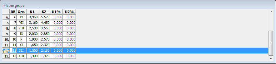 U podprozor "Platne grupe" unose se redni broj i oznaka platne grupe u kolonu "Ozn.", koeficijent ili raspon koeficijenata po kojima