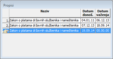 U podprozor "Propisi" unose se aktuelni propisi u kolonu "Naziv" kojima se propisuju platne grupe, datum donošenja u kolonu