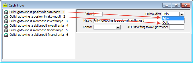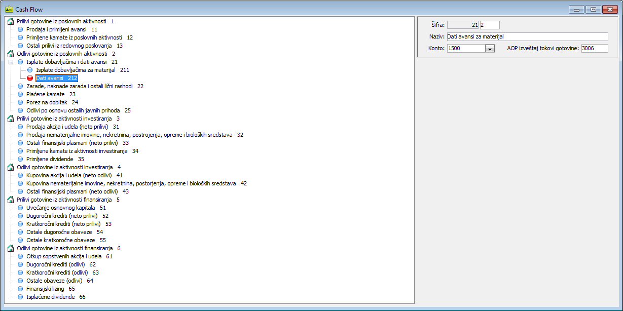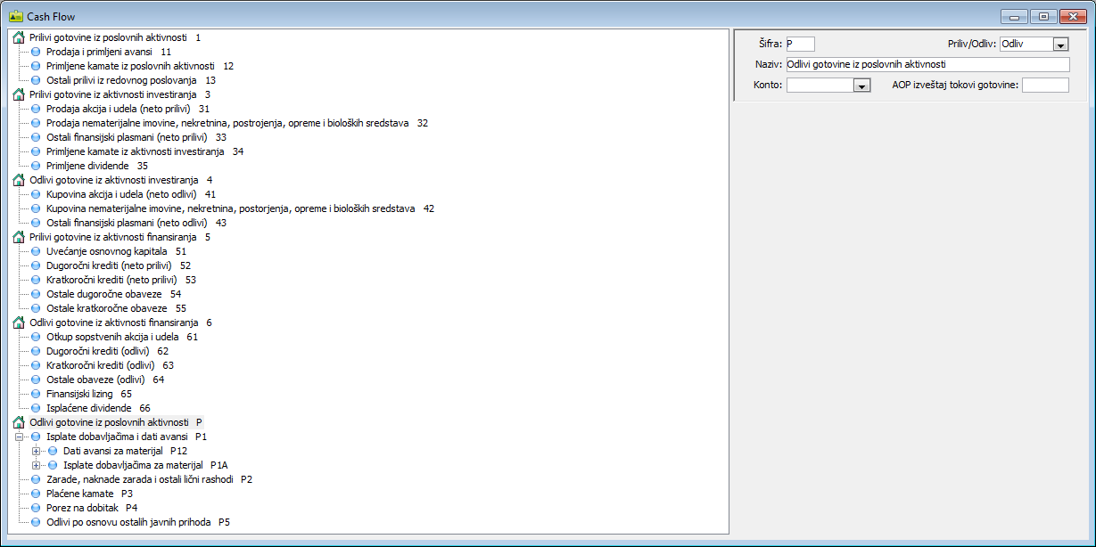 Potrebno je definisati prve nivoe strukture priliva i odliva novčanih sredstava i za svaki izabrati odgovarajuću stavku iz
