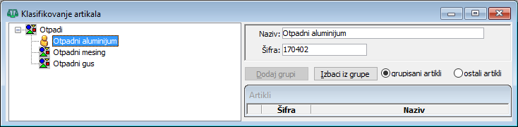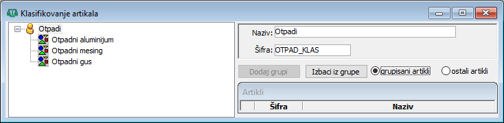 Artikli grupe: (naziv selektovanegrupe) - štampa se spisak artikala dodeljenih selektovanoj klasifikaciji.