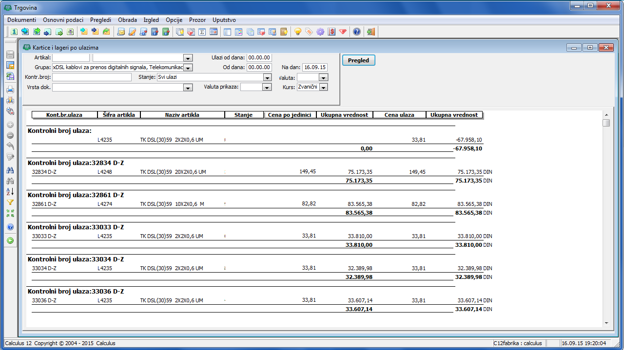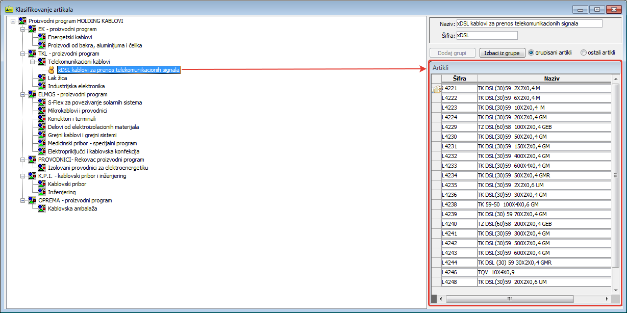 Kod dobro postavljene klasifikacije možemo npr. kod pregleda lagera po ulazima štampati kontrolne brojeve ulaza samo kablova za prenos digitalnih signala (xDSL) (vidi sliku)