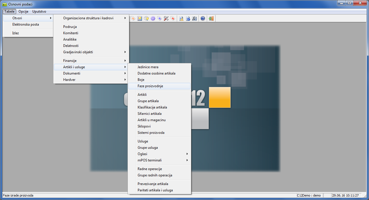 Artikli i usluge - Faze proizvodnje. U ostalim aplikacijama paketa klikom na opciju glavnog menija Osnovni podaci - Faze proizvodnje