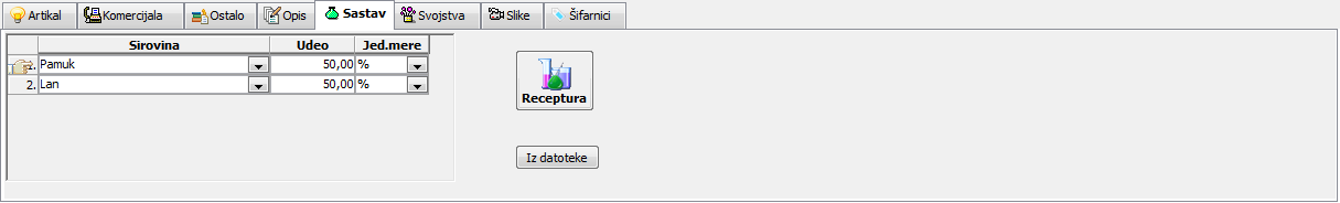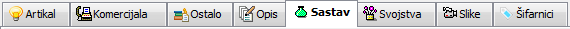 Listić "Sastav" - obuhvata unos, obradu, brisanje ili pregled sirovinskog sastava artikla (vidi sliku)