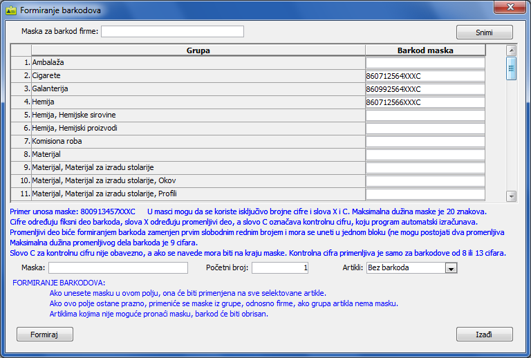Klikom na dugme "Generiši barkod" otvara se prozor za automatsko višestruko generisanje barkodova za selektovane artikle na osnovu formirane barkod maske ( vidi sliku )