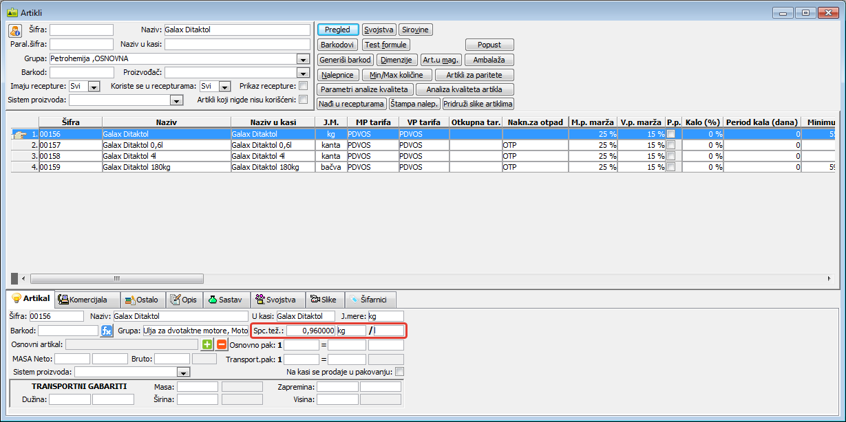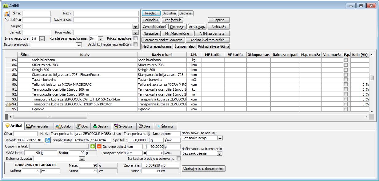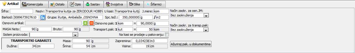 "Šifra", "Naziv", "Jedinica mere", "Grupa" i sl.; podaci o specifičnoj težini, barkodu, gabaritima,