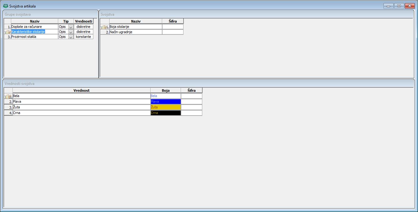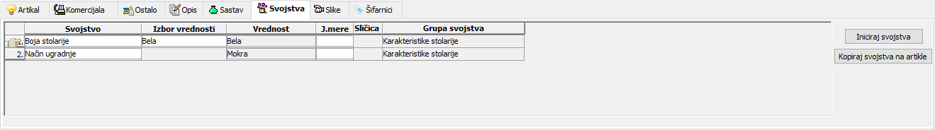 Ovde dodeljujete svojstva artiklu. U kolonu "Svojstvo" unosite jedno ili više svojstava artikla koja su prethodno definisana u prozoru Svojstva. U kolonu "Izbor vrednosti" unese se vrednost svojstva definisana u podprozoru "Vrednosti svojstva". Dugmetom "Iniciraj svojstva" možete inicirati unos svih svojstava ili onih svojstava definisanih na grupi kojoj taj artikal pripada u prozoru "Grupe artikala".