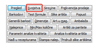 Prozor za definisanje svojstava artikala poziva se klikom na dugme "Svojstva"
