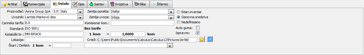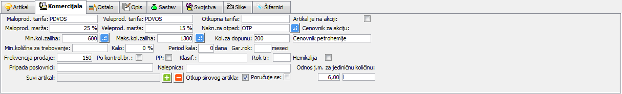 kao što su npr.: "šifra", "naziv", "grupa". Postoje i polja za potvrdu - npr. artikala koji nigde nisu korišćeni kao i
