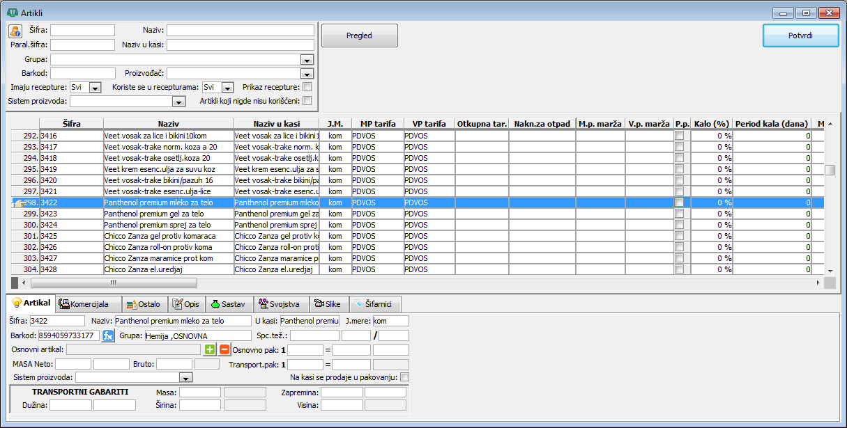Komercijalni podaci artikla - pregled artikala sa podacima šifra, naziv, jedinica mere, bar kod, tarife, marže, carinske tarife, minimalne količine itd.