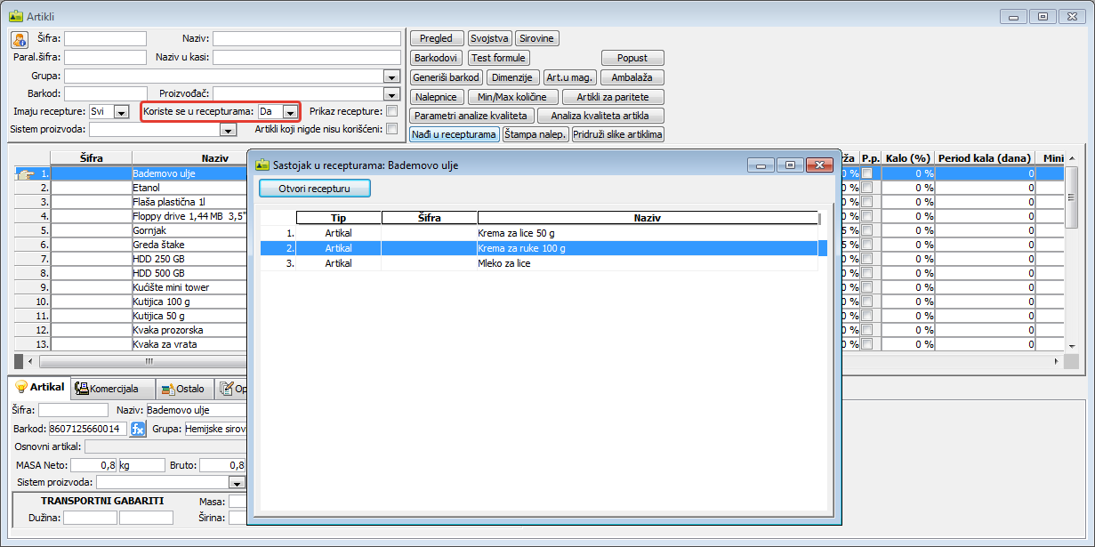 Opcija "Samo artikli sa recepturom" postavlja kriterijum za prikaz samo onih artikala koji imaju recepturu. Opcija "Prikaz recepture"