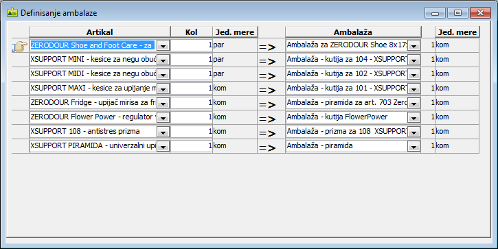 , otvarate prozor "Definisanje ambalaže" u kome definišete vezu između artikla (proizvoda) i njegove ambalaže ( vidi sliku )