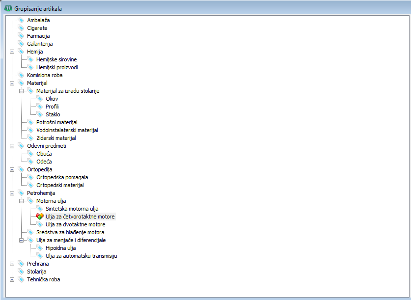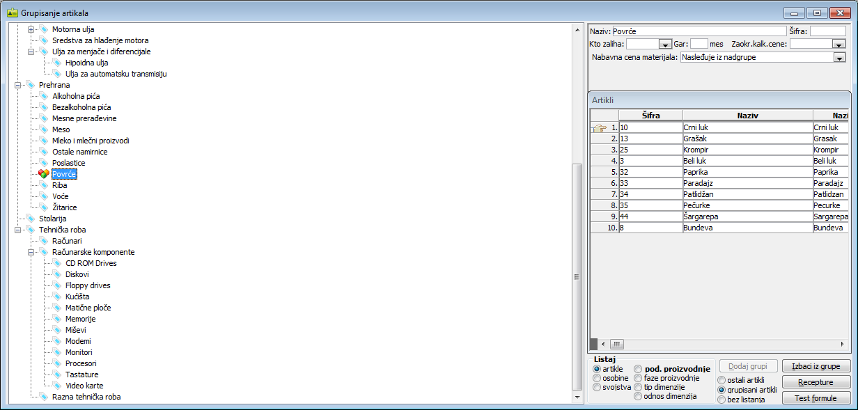 Prozor "Grupe artikala" koristite da grupišete artikle. U preduzećima često postoji potreba za zbirnim pregledima