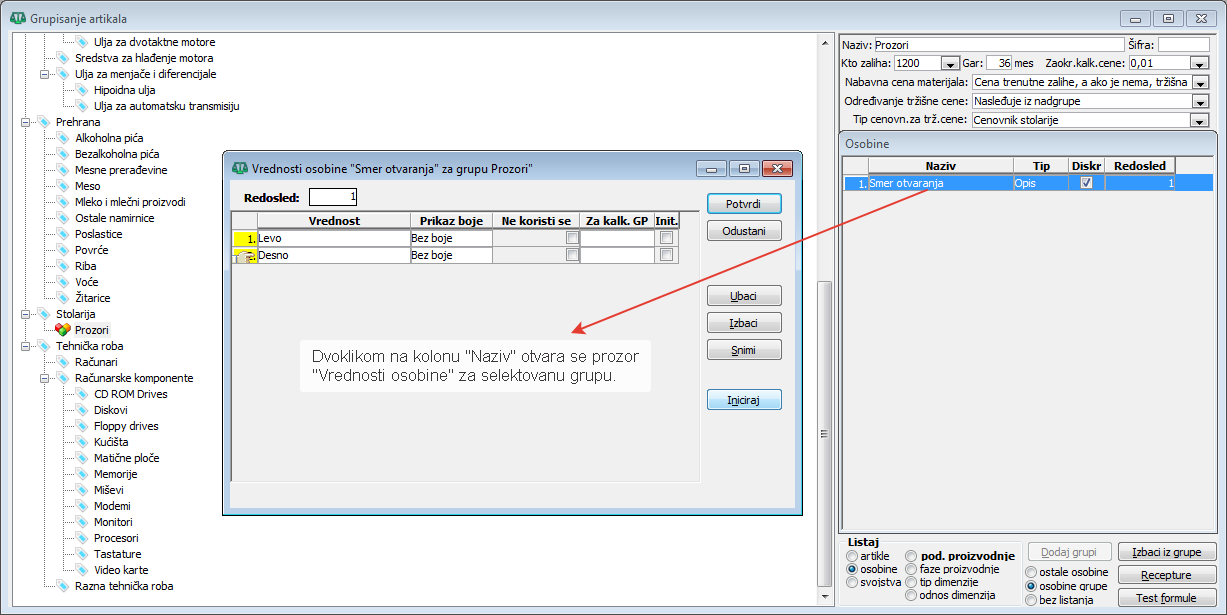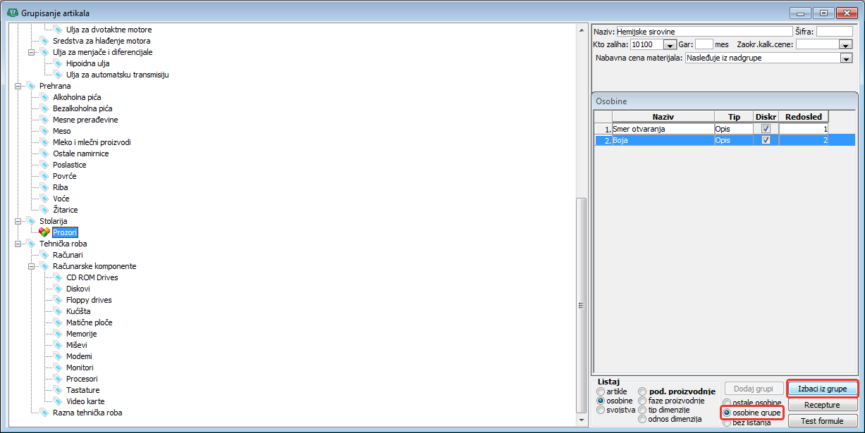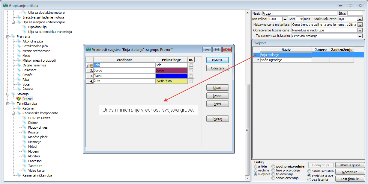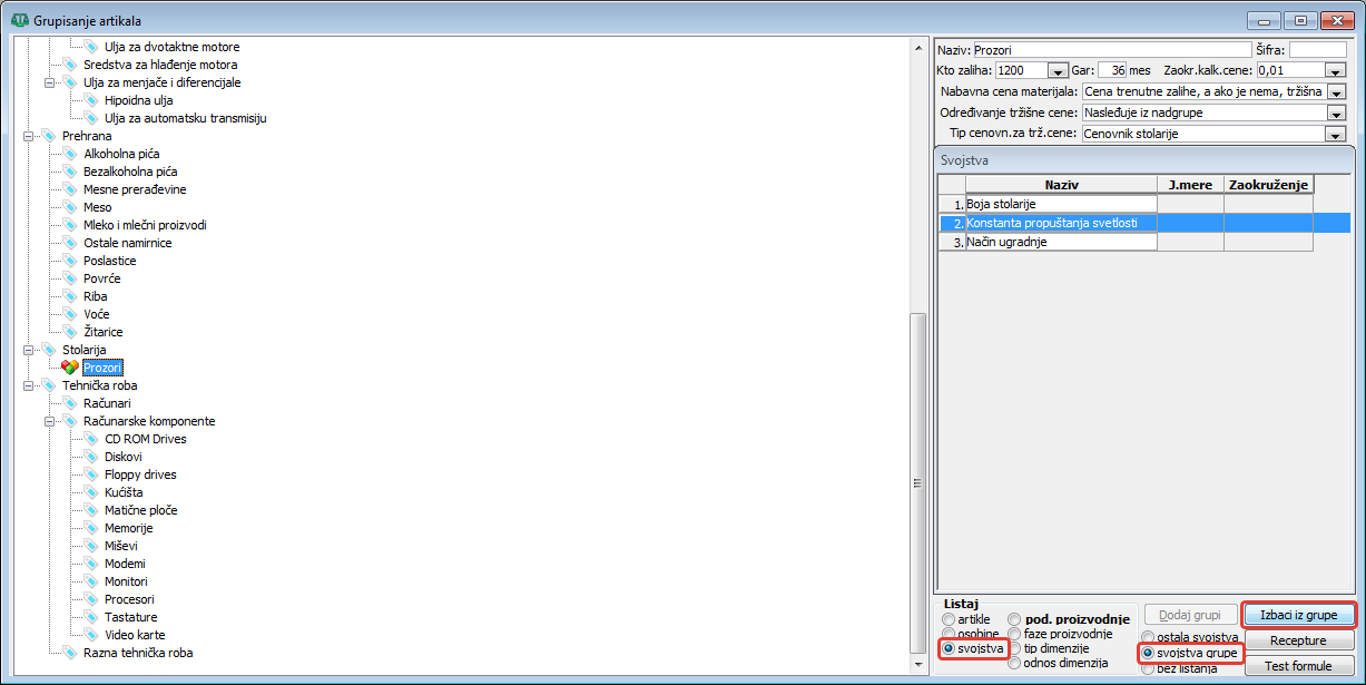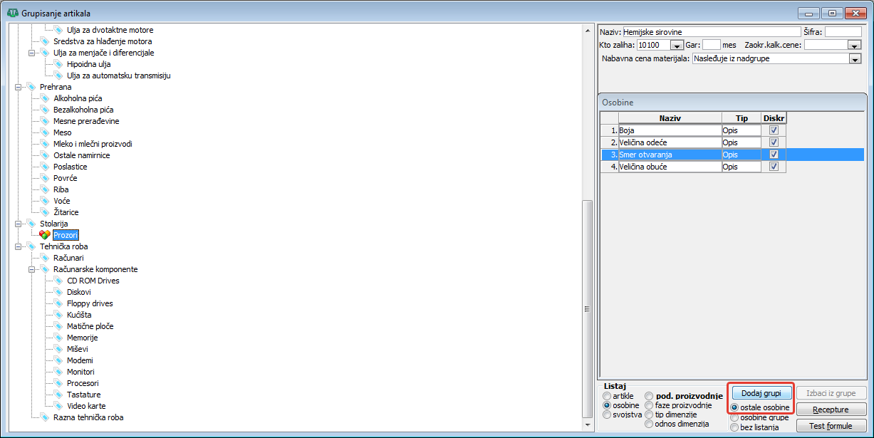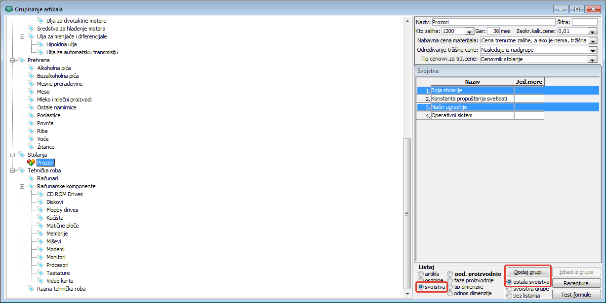 Na potpuno isti način je moguće za selektovanu grupu artikala definisati i određena svojstva.