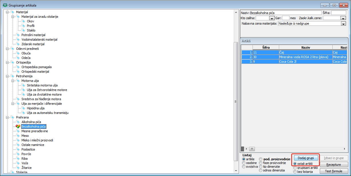"Ostali artikli" a zatim klikom na dugme "Dodaj grupi" dodele selektovanoj grupi