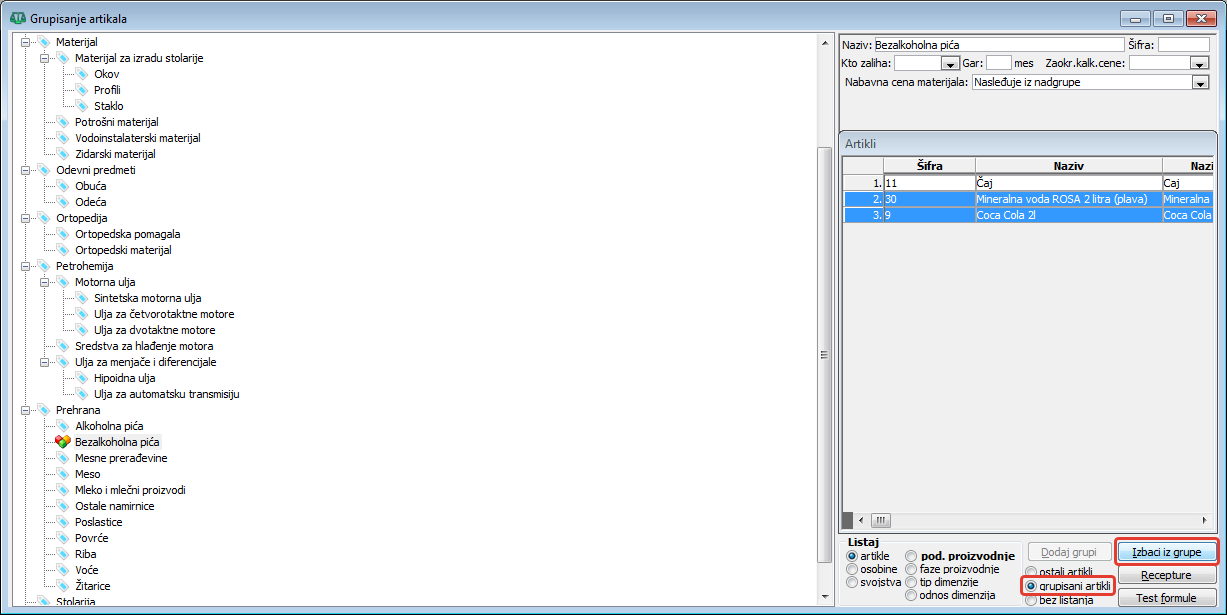 Artikli se izbacuju iz grupe tako što se selektuje grupa u stablu, klikne na radio dugme "Grupisani artikli" i selektuju