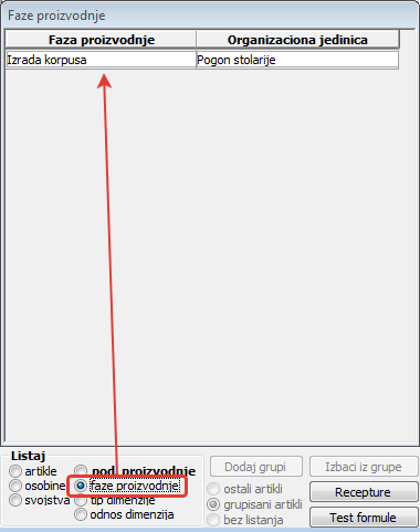 Za dobijenje jednog gotovog proizvoda može biti dovoljna samo jedna faza proizvodnje. Međutim u praksi se događa da jedan proizvod prođe kroz više faza proizvodnje do finalizacije. Potvrđivanjem polja "faze proizvodnje" omogućen je unos predefinisanih faza proizvodnje u kolonu Faze proizvodnje. Za svaku fazu proizvodnje odredite i organizacionu jedinicu u kojoj se realizuje ta faza ( vidi sliku )