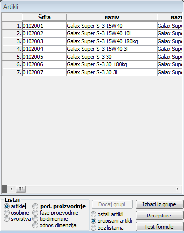 Klikom na dugme "Test formule" proveraju se postojeće formule za recepture artikala koji pripadaju određenoj grupi, što je objašnjeno u prozoru "Artikli" - Test formule.