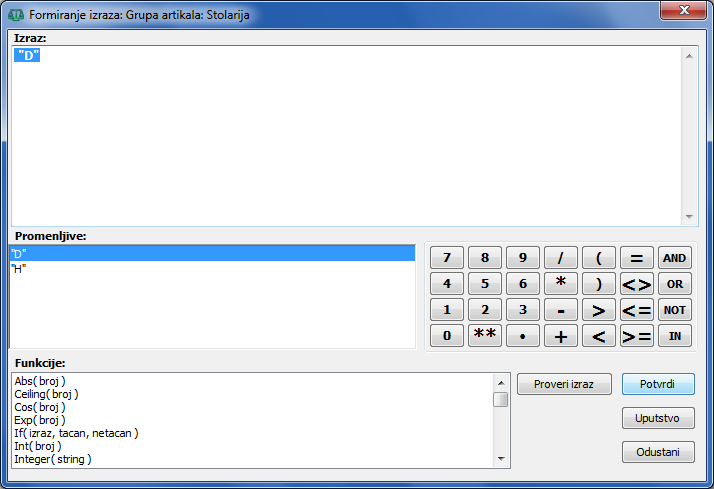 otvarate prozor za formiranje izraza. Po izlasku iz prozora za formiranje izraza u nastavku funkcijskog dugmeta biće ispisana formula odnosa dimenzija u koloni "Formula" ( vidi sliku )