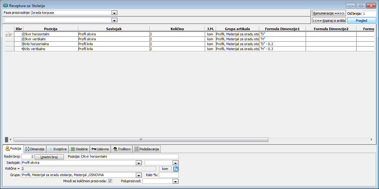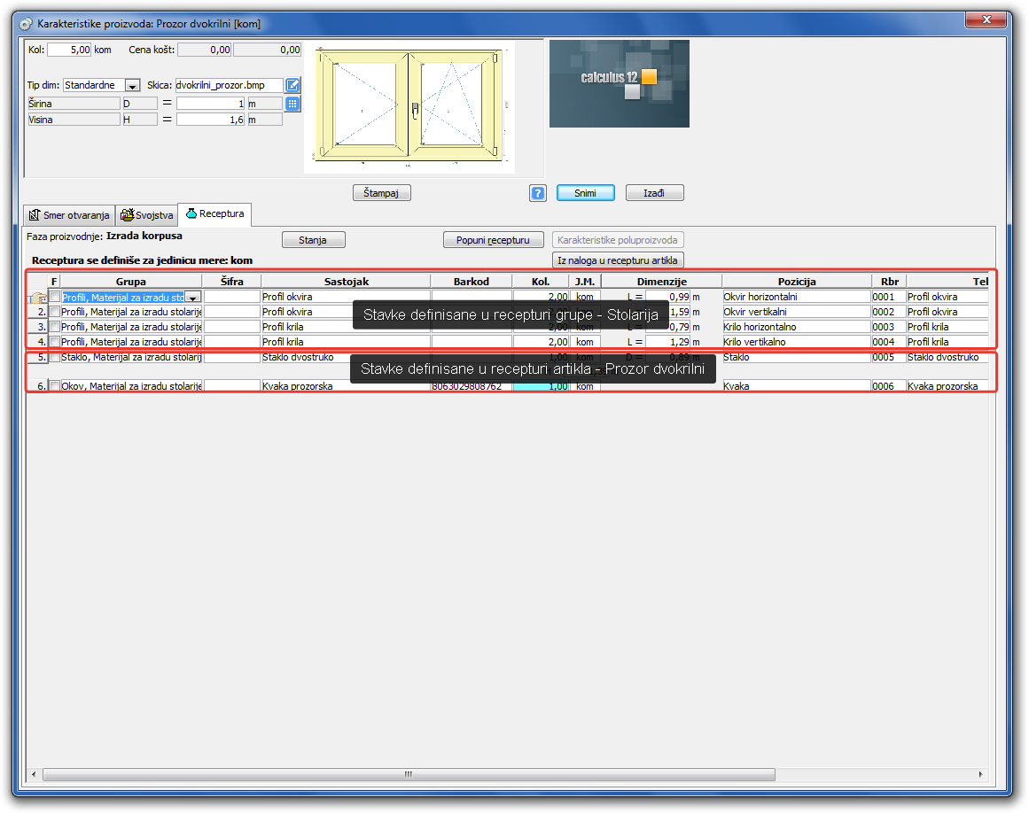 , u polje "Kalo u proizv:" unosi se utvrđeni procenat kala tokom proizvodnje. Potvrdite polje "Krojna lista:" koja se koristi npr. kod izrade različitih vrsta prozora ( sa otvaranjem na različitu stranu, dvoslojni, različitih dimenzija i sl. ).