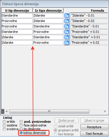 Potvrđivanjem polja "odnos dimenzija" dostupno je definisanje odnosa dimenzija za grupu artikala (proizvoda). U kolonu "U tip dimenzije" iz padajuće liste odaberite tip dimenzije za koji uspostavljate odnos dimenzija. U koloni "Iz tipa dimenzije" odaberite tip dimenzije koji će biti funkcijska promenljiva prilikom formiranja izraza za pretvaranje jednog tipa dimenzije u drugi tip. Klikom na funkcijsko dugme