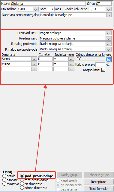 : u polje "Proizvodi se u:" organizacionu jedinicu, obično pogon, u kome se artikli grupe proizvode, u polje "Predaje se u:" unosi se magacin u koji se proizvedeni artikal odlaže posle završenih faza proizvodnje (obično je to magacin gotovih proizvoda, u polje "R.nalog proizvoda:" vrsta predefinisanog radnog naloga, u polje "R.nalog poluproizvoda:" radni nalog za poluproizvode, u polje "Dimenzija" definiše se jedna ili više dimenzija artikla sa oznakom u polje "Oznaka" i jedinicom mere u polje "Jedinica mere", u polje "Odnos dim. premaj.mere" klikom na funkcijsko dugme