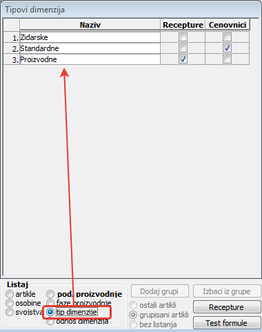 Potvrđivanjem polja "tip dimenzije" omogućen je unos i definisanje tipova dimenzija za grupu artikala (proizvoda). Unesite naziv tipa dimenzije u kolonu "Naziv". Za taj tip dimenzije moguće je potvrditi i kolone "Recepture" i "Cenovnici" koje bliže određuju koji će se tip dimenzija koristiti u recepturama proizvoda a koji za prikaz dimenzija u cenovnicima ( vidi sliku )