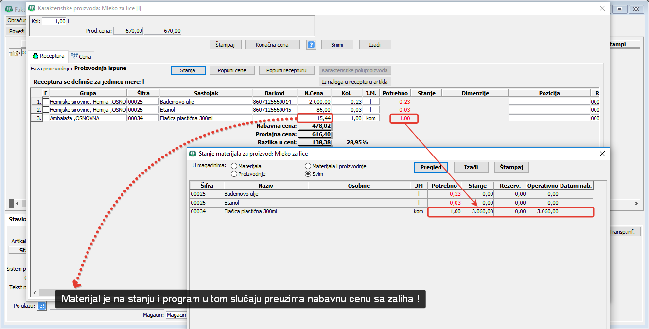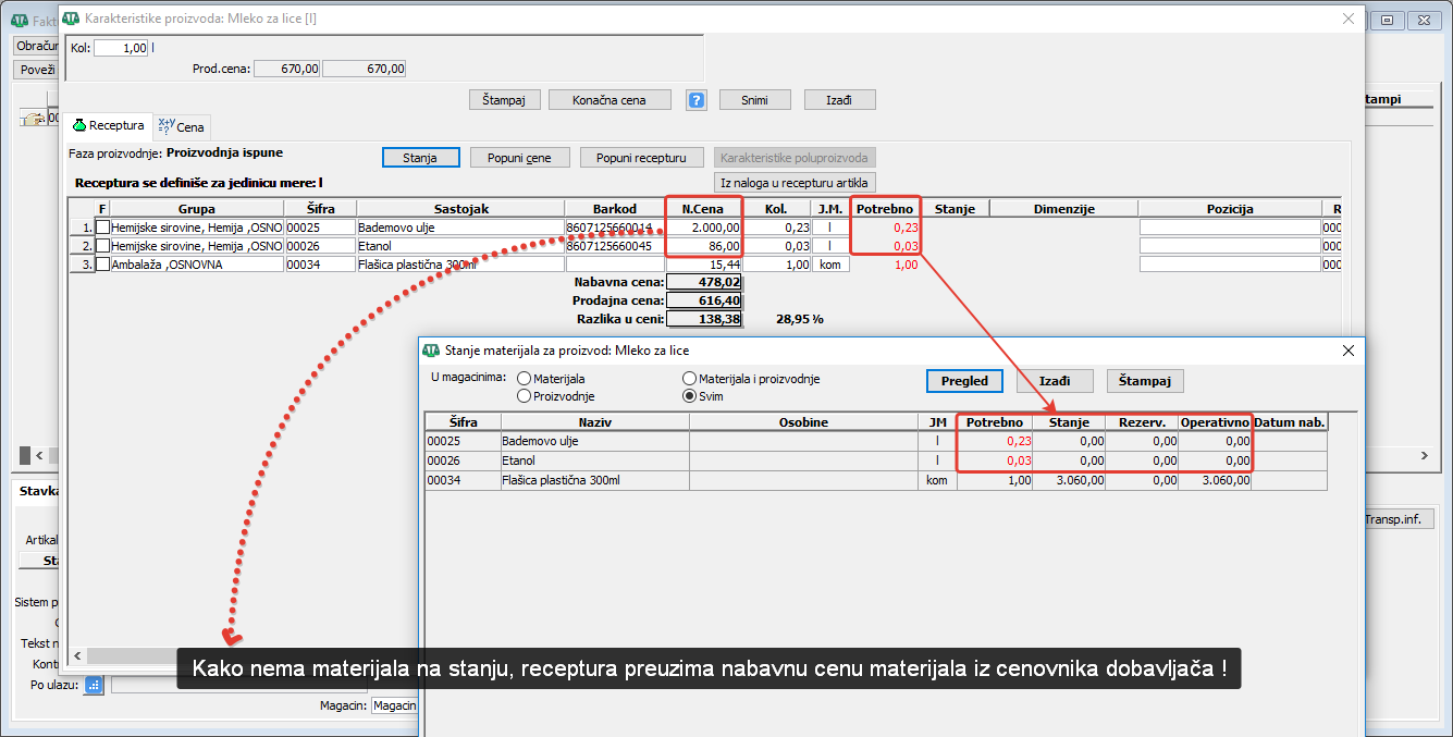 Prilikom definisanja podataka za proizvodnju grupe artikala inicijalno postavljena vrednost polja "Nabavna cena materijala:" za preuzimanje cene materijala je "Nasleđuje iz nadgrupe" ( vidi sliku )