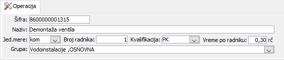 U listić "Operacija" unose se šifra u polje "Šifra:" i naziv radne operacija u polje "Naziv:", jedinica mere u polje "Jed. mere:", broj radnika potrebnih za izvršenje radne operacije u polje "Broj radnika:", kvalifikacija koja je potrebna da bi se određena radna operacija obavljala u polje "Kvalifikacija:", potrebno vreme po radniku izraženo u radnim časovima u polje "Vreme po radniku:" i grupa radnih operacija ukoliko određena radna operacija pripada nekoj od postojećih grupa u polje "Grupa:" (vidi sliku)