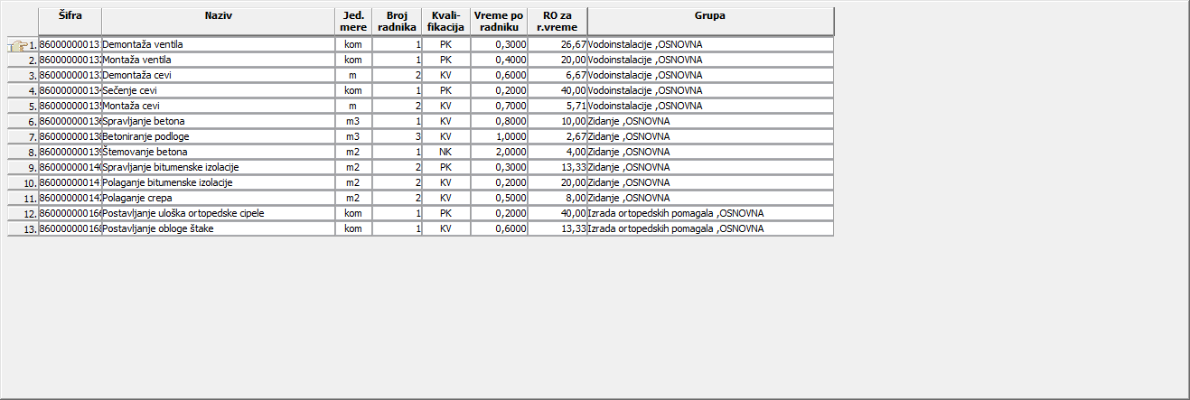 Spisak: Radne operacije - štampa se spisak unetih radnih operacija.