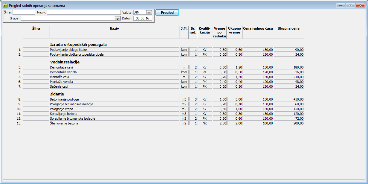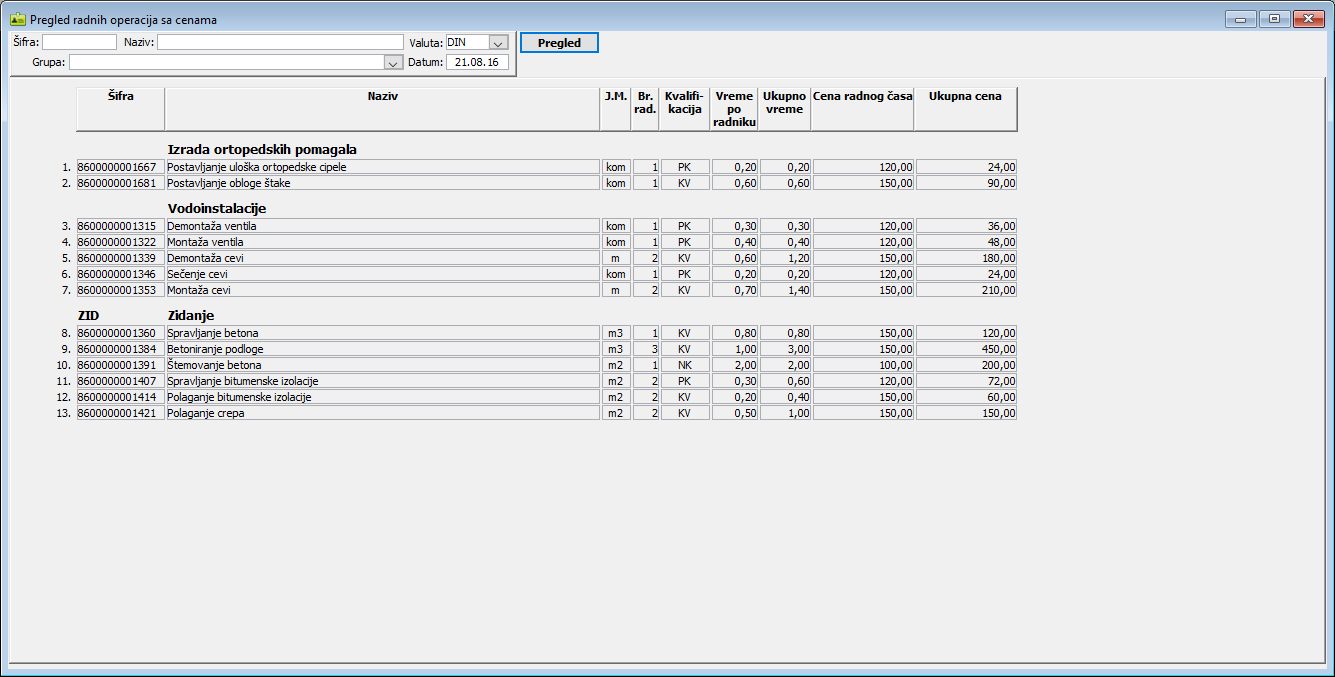 Klikom na dugme "Pregled sa cenama" otvara se prozor "Pregled radnih operacija sa cenama". Postavite filter i datum i/ili kliknite na dugme "Pregled" da izlistate pregled radnih operacija sa cenom radnog časa i ukupnom cenom po radnim operacijama.