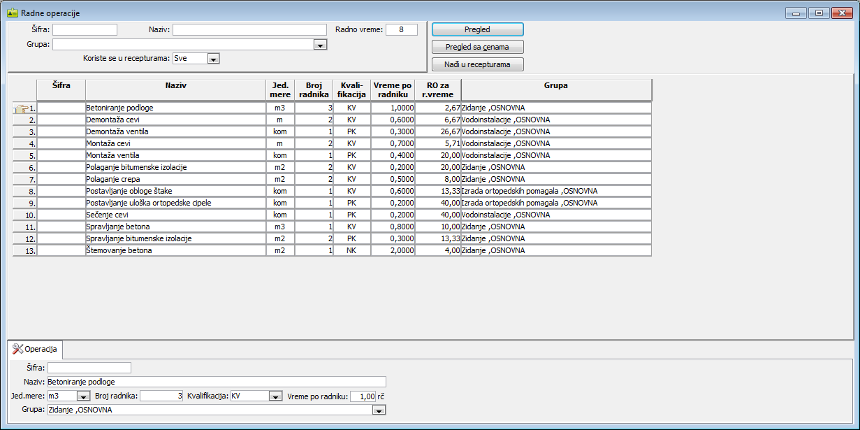 Oblast filtera prozora "Radne operacije" koristi se za pretraživanje unetih radnih operacija. Iz padajuće liste "Grupa:" izaberite grupu iz koje želite prikaz radnih operacija ili u polje "Šifra:" ili "Naziv:" unesite pun naziv ili deo naziva radne operacije za koje zahtevate pregled ( vidi sliku )