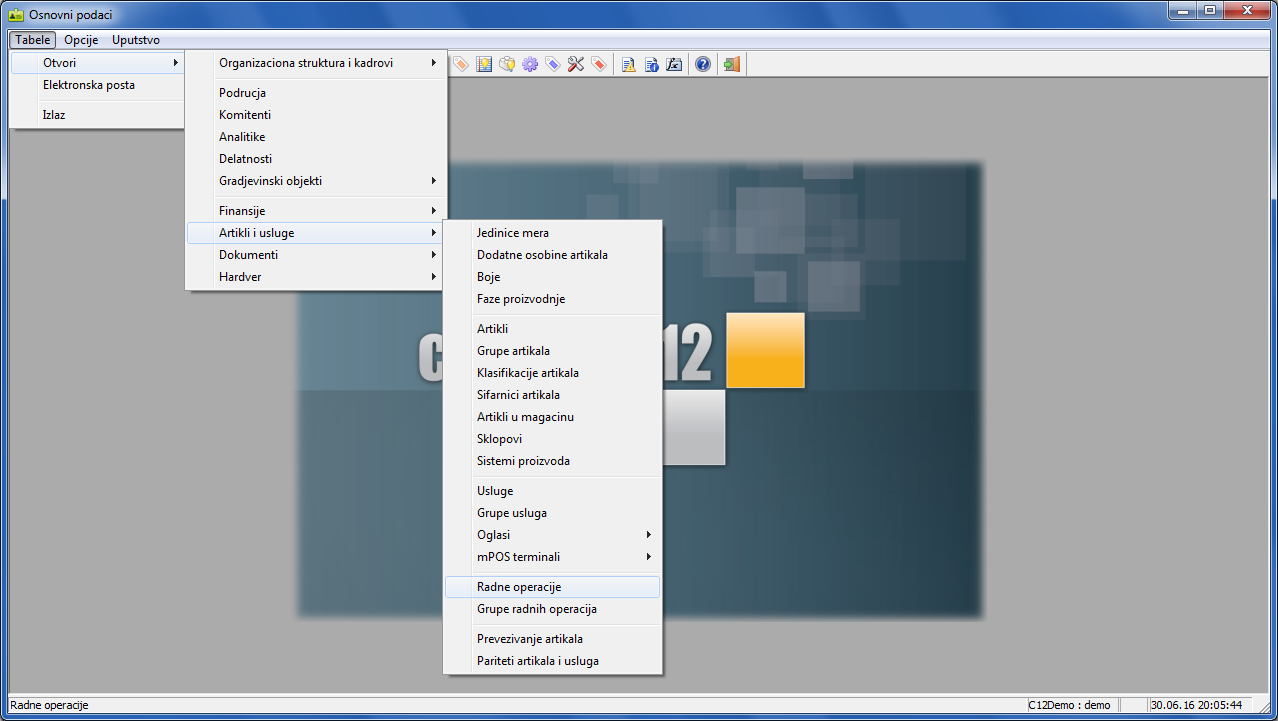 U glavnom meniju programa "Osnovni podaci" odaberite stavku "Tabele - Artikli i usluge - Radne operacije"