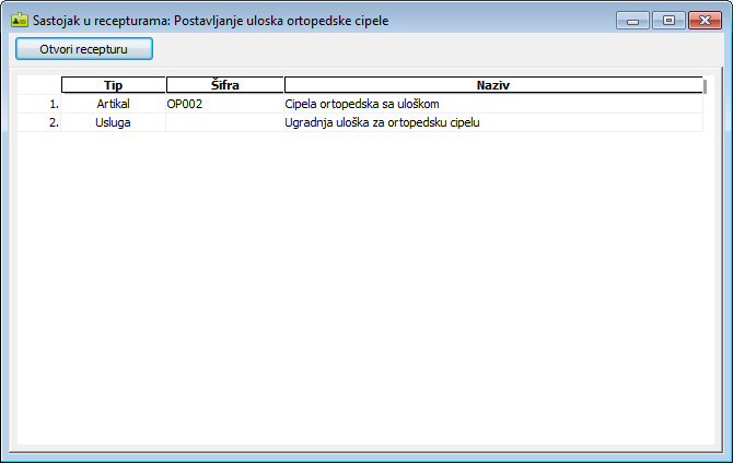 Klikom na dugme "Nađi u recepturama" otvara se potprozor "Sastojak u recepturama: (naziv operacije)" sa spiskom svih sastojaka.