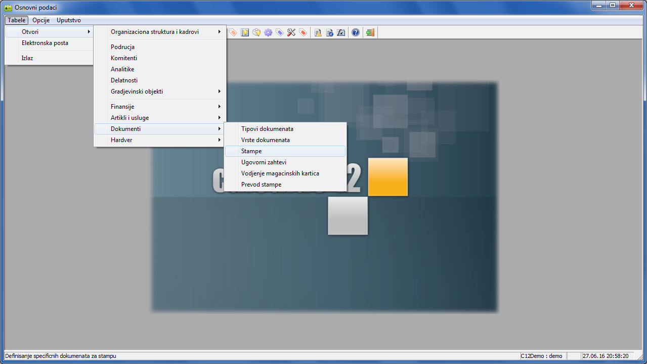 na sledeći način "Tabele - Otvori - Dokumenti - Štampe" ( vidi sliku )