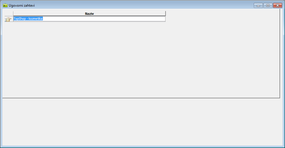Do prozora "Ugovorni zahtevi" dolazi se iz opcija glavnog menija programa "Osnovni podaci",
