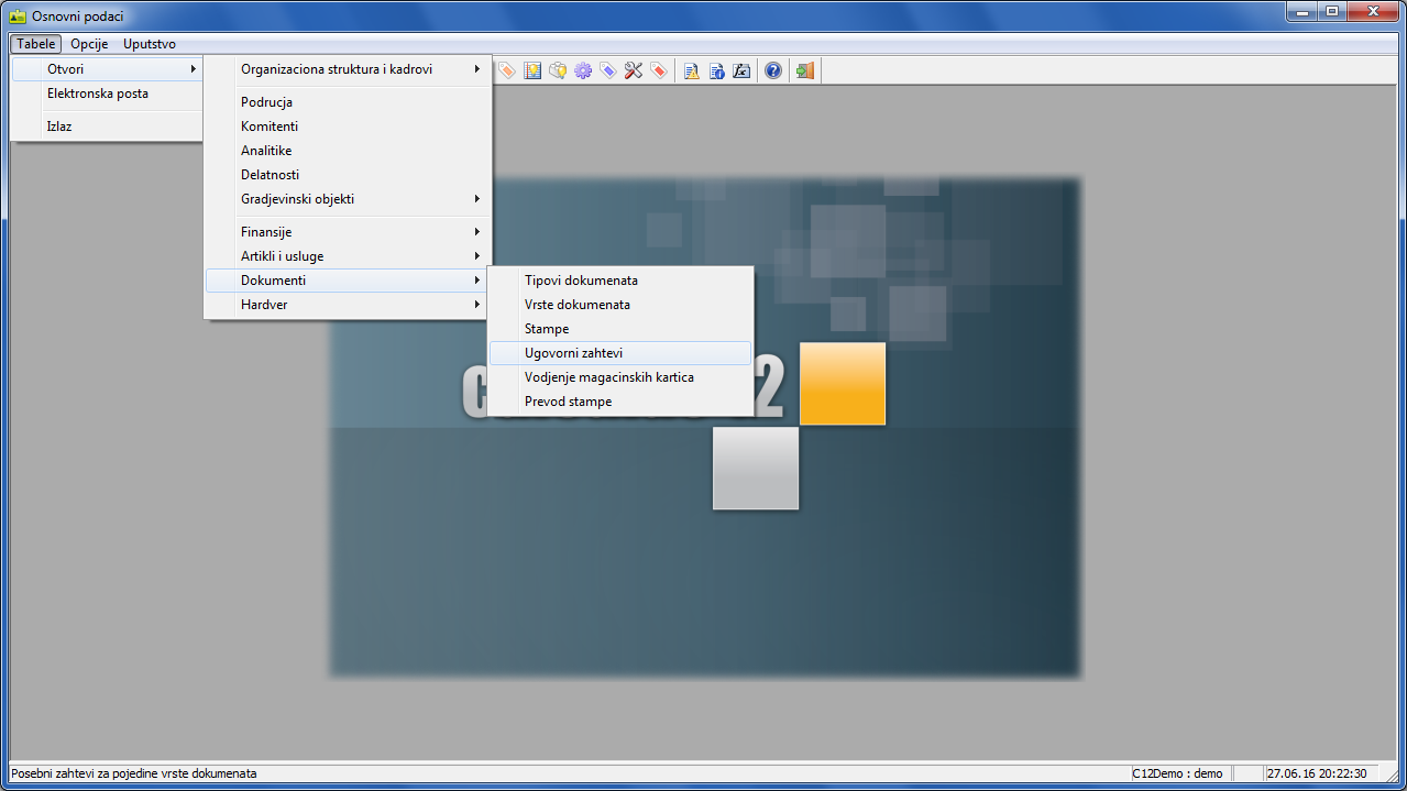 na sledeći način "Tabele - Otvori - Dokumenti - Ugovorni zahtevi"