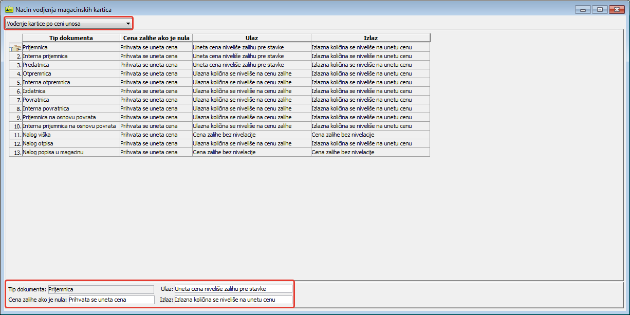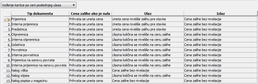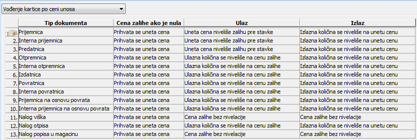 Za magacine koji se vode po ceni unosa, definišemo za svaki magacinski dokument naveden u koloni "Tip dokumenta" način