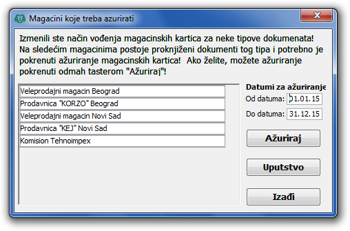 izmeni neki detalj, ovaj prozor se automatski otvara da omogući korisniku ažuriranje kartica svih magacina na koje utiče izmena.