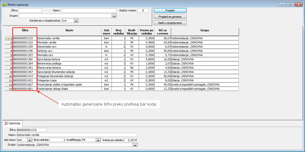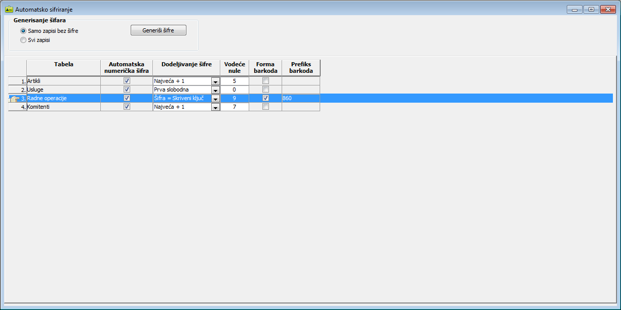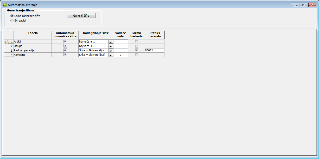 Šifra će biti formirana u obliku barkoda koji na početku uvek sadrži prefiks definisan u koloni "Prefiks barkoda" plus broj cifara