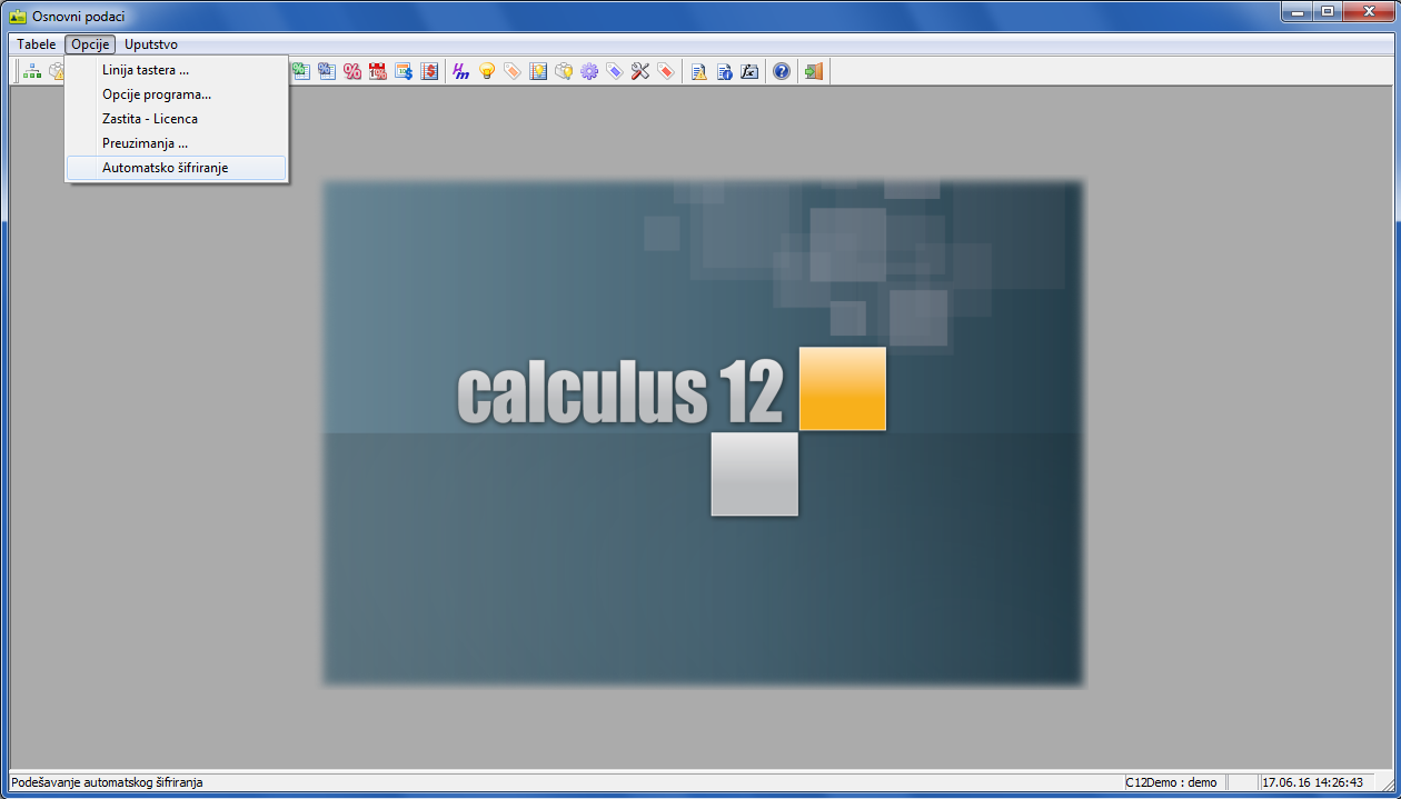 Do prozora "Automatsko šifriranje" dolazi se iz opcija glavnog menija programa "Osnovni podaci",